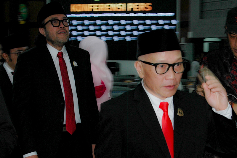 Ketua DPRD Jabar Periode 2024-2029 Buky Wibawa didampingi Wakil Ketua DPRD Jabar Ono Surono berjalan menghampiri wartawan untuk memberikan keterangan dalam Konferensi Pers di Gedung DPRD, Rabu (9/10/2024). (Foto: Rivansyah Dunda)