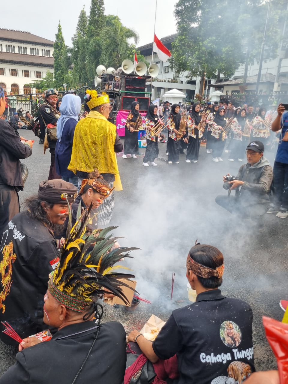 ALGIVON.IDSebuah pemandangan unik hadir di halaman Gedung Sate, Bandung, Kamis sore (5/9/2025). Tokoh budaya dan pegiat lingkungan Jawa Barat (Jabar)  Dadang Hermawan Arthayuda atau yang akrab disapa Mang Utun, menggelar demo berbalut Seni Budaya Sunda (Aksi Budaya) soal Tunjangan DPRD Jabar.