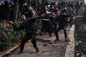 Seorang demonstran melempar batu ke tameng Polisi anti huru hara saat aksi tolak Revisi RUU Pilkada, di depan Gedung DPRD Jabar Kota Bandung, Kamis (22/8/2024). FOTO: Rivansyah Dunda