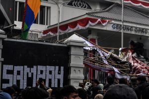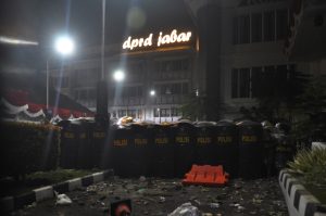 Aksi itu berakhir ricuh setelah para demonstran berhasil menjebol pagar gedung saat petang. Peristiwa tersebut terjadi pada jam enam kurang lima menit sore. Setelah menjebol pagar gerbang, massa aksi kemudian melempari Gedung DPRD Jabar berbagai benda mulai dari botol hingga batu. Melihat kondisi tersebut, pihak kepolisian pun mencoba untuk menertibkan massa aksi dan memberikan imbauan. Namun demikian, massa aksi tak menggubris imbauan tersebut.