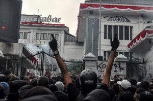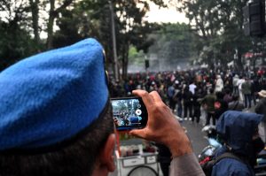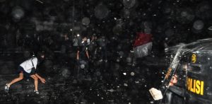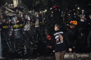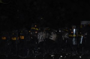 Massa aksi pun terus melakukan pelemparan ke area gedung. Aparat keamanan pun berusaha membubarkan massa aksi dengan mobil water cannon. Kemudian sekitar jam enam lewat dua puluh sore, polisi pun menembakan gas air mata ke kerumunan massa aksi. Para demonstran langsung berlarian ke arah Jalan Trunojoyo hingga Simpang Dago.